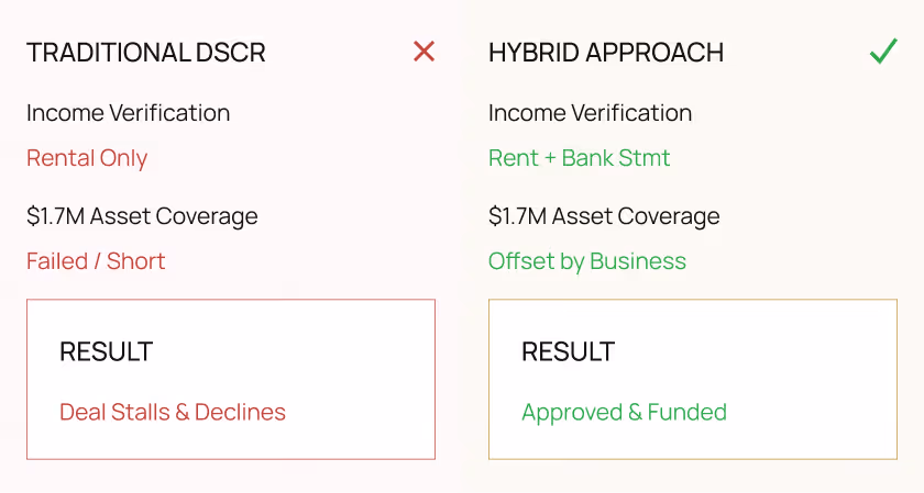 Rather than forcing the deal into a traditional DSCR framework, the team restructured the transaction mid-process. The solution was a hybrid DSCR + bank statement qualification approach. This allowed the underwriting model to evaluate two income sources simultaneously:
