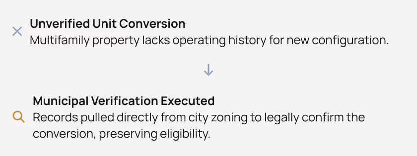 One property in particular created underwriting challenges. A multifamily property had a unit conversion that required verification through city zoning records, forcing the team to dig through municipal documentation to confirm the legality of the configuration. Without confirming the zoning details, the property could have become ineligible within the lending structure.